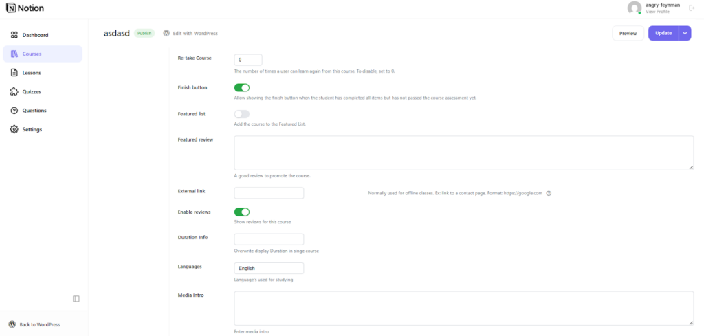 Starting off, instructors can now handle course creation in a completely distraction-free environment. With the new interface built right into our WordPress LMS plugin, you no longer have to wrestle with the clunky default WordPress post editor. The clean Overview tab acts as your creative canvas. You can write engaging descriptions for your online courses, set permalinks, and upload featured images seamlessly.