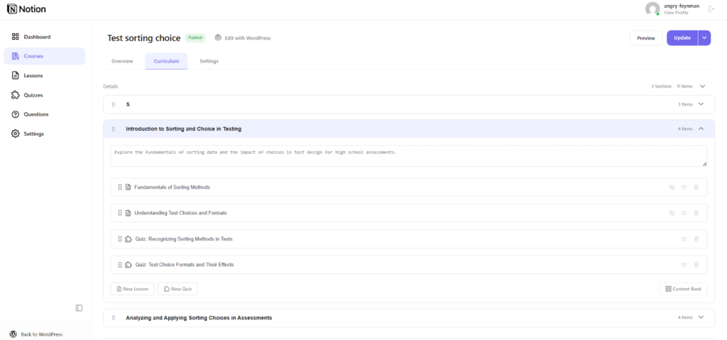 One of the most highly anticipated features of the LearnPress Course Builder is finally here—a true visual drag-and-drop curriculum. Structuring lessons has always been the core of an LMS Dashboard experience, and now we’ve made it incredibly intuitive. You can easily add sections or set up quizzes simply by dragging them into place. If you already have existing materials for other online courses, just pull them directly from the Content Bank. This flexibility gives you a lightning-fast way to handle course creation.