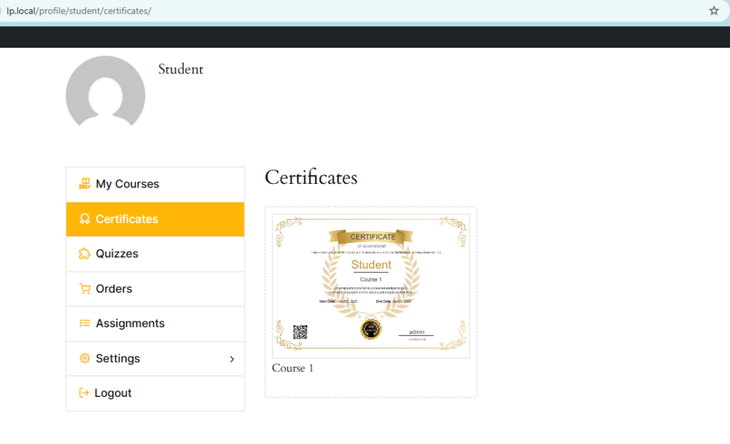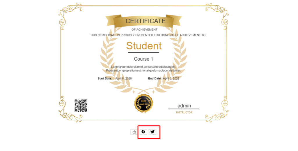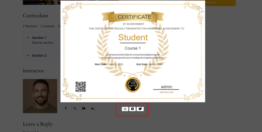 Show certificate popup: When this option is enabled, the certificate image will be displayed immediately after the student completes the course