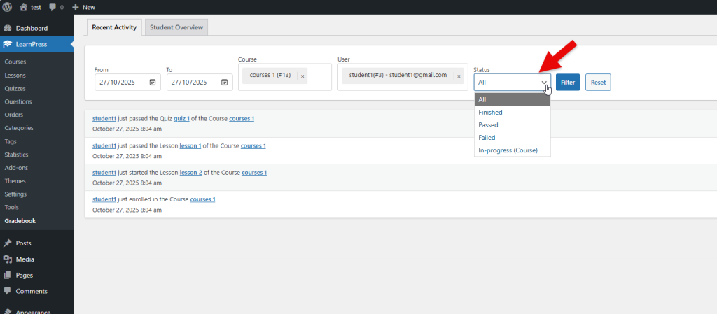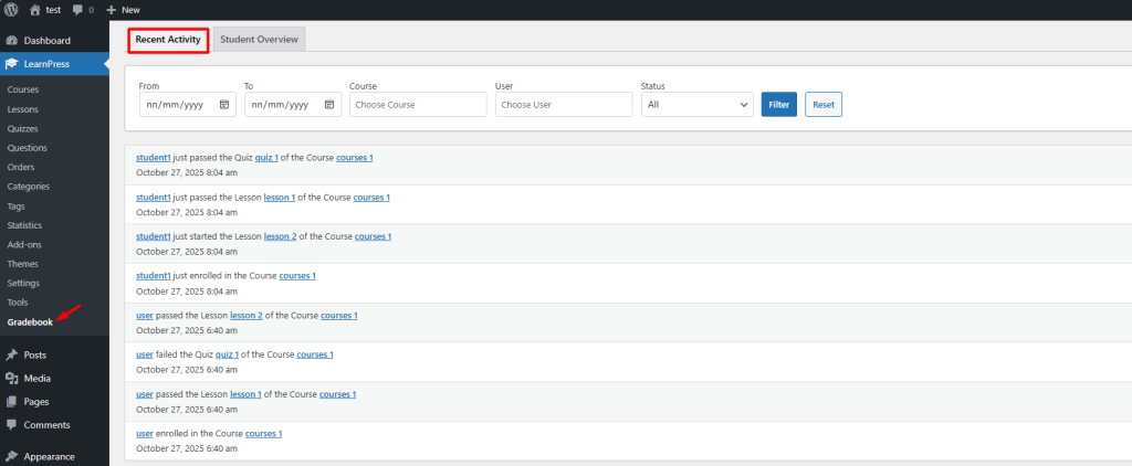 • Visit ‘LearnPress > Gradebook > Recent Activity’