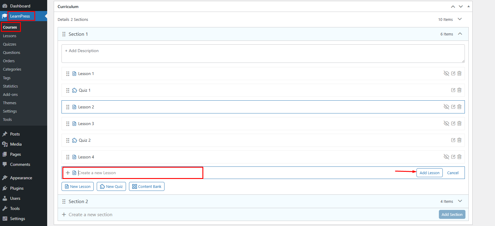 Way 2: You can also add new lessons while creating/editing a course. Please go to Learnpress => Courses => Add new/Edit course => Scroll to Curriculum, write section name and press Enter => Create a new lesson. You can see the photo below: