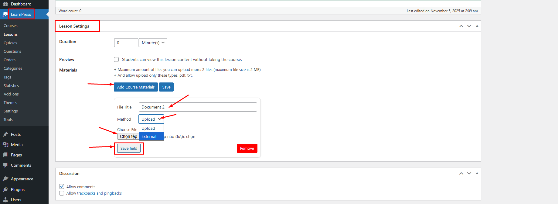 Users can upload attachments for the lesson here, by clicking “Add course material” => after uploading the file, click “Save field” to upload the file