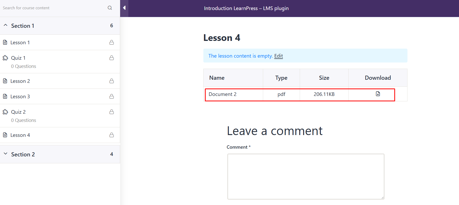 You can set the Lesson Duration, allow customers to preview the lesson content before purchasing, allow users to upload additional materials, allow users to add comments