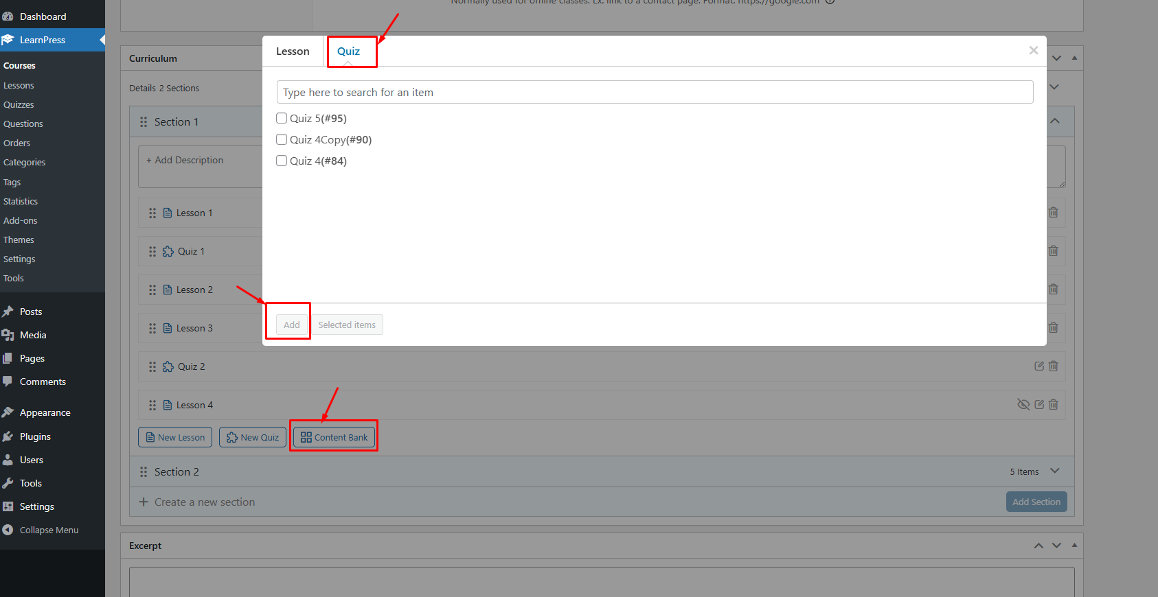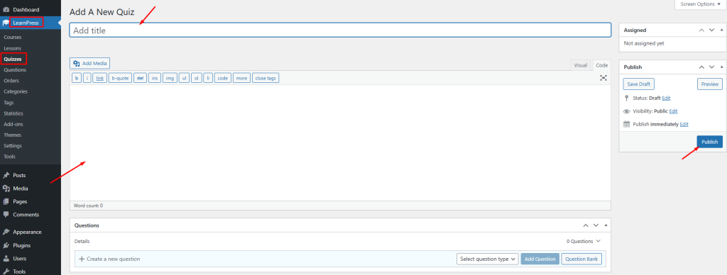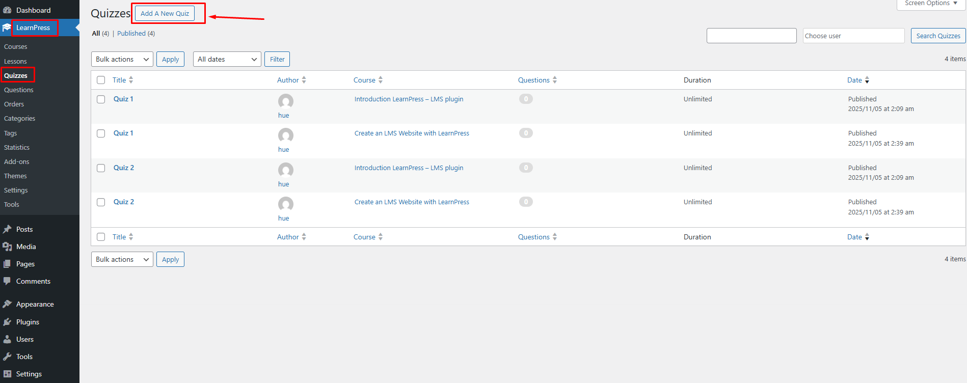 To create a new quiz, you can go to your Dashboard => LearnPress => Quiz => Add A New Quiz. You can see in below picture.