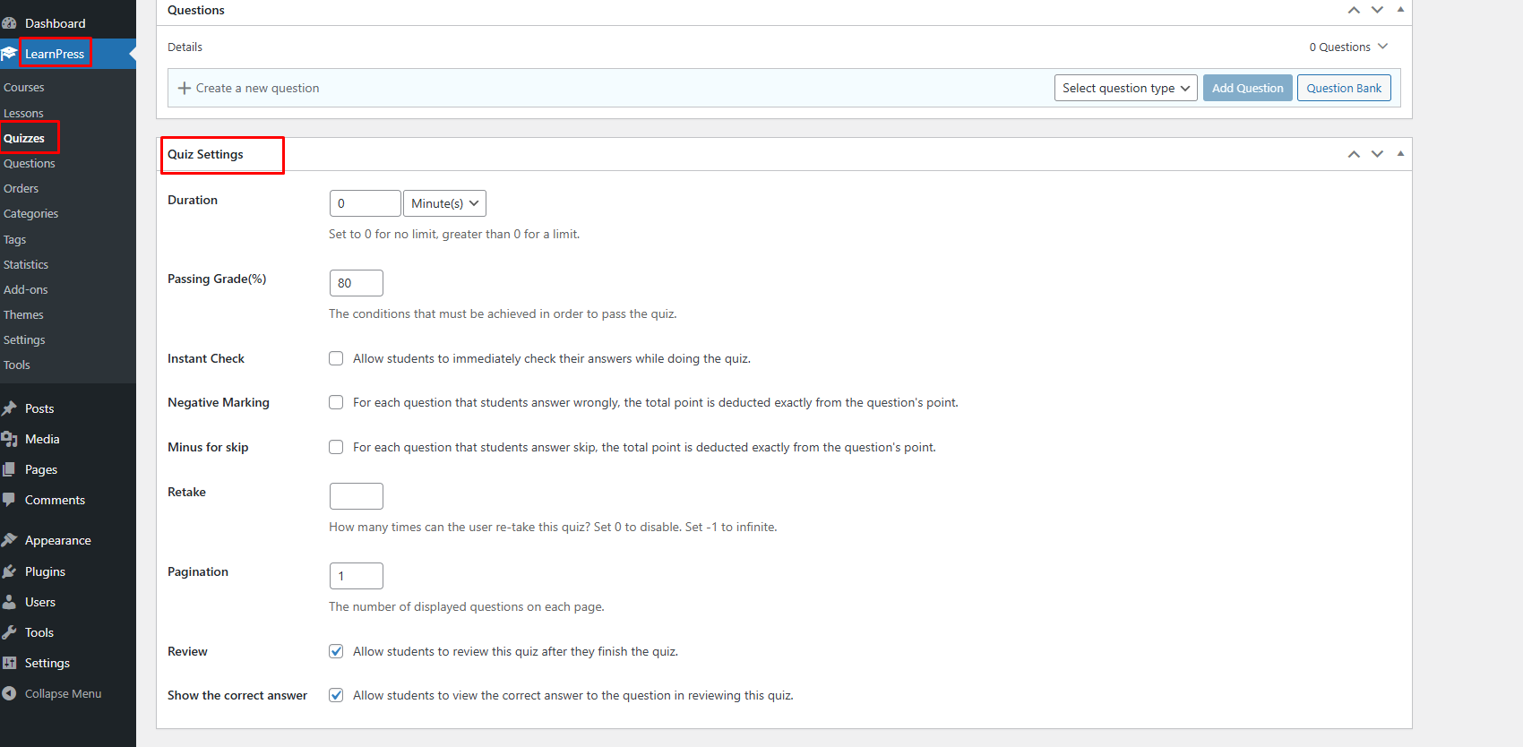 In this section, we will guide you on how to create a quiz and configure quizzes settings.