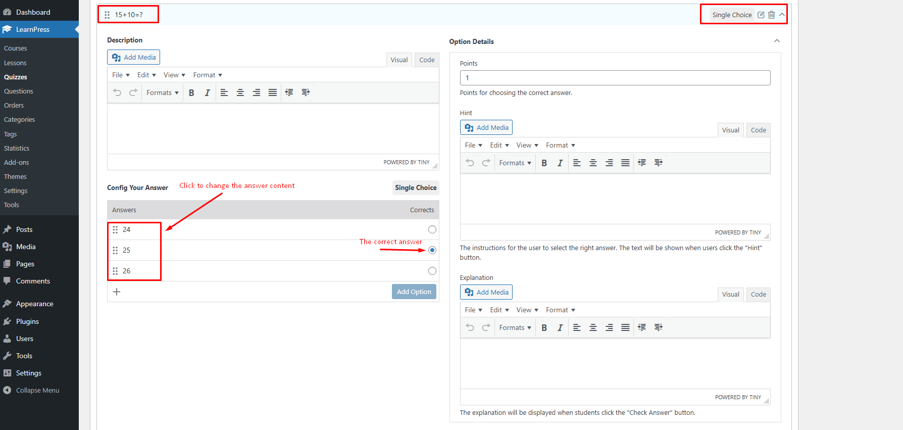 To create a single choice question, you need to enter the options and choose the correct answer, you can add more options by click “Add option” bottom. You can see the picture below.