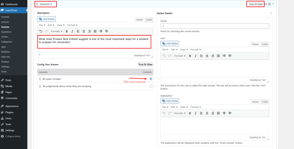 In the True/False question, you need to put question name, question content, choose the correct answer.