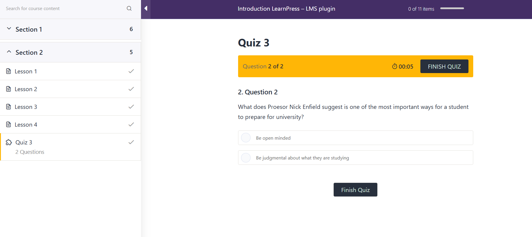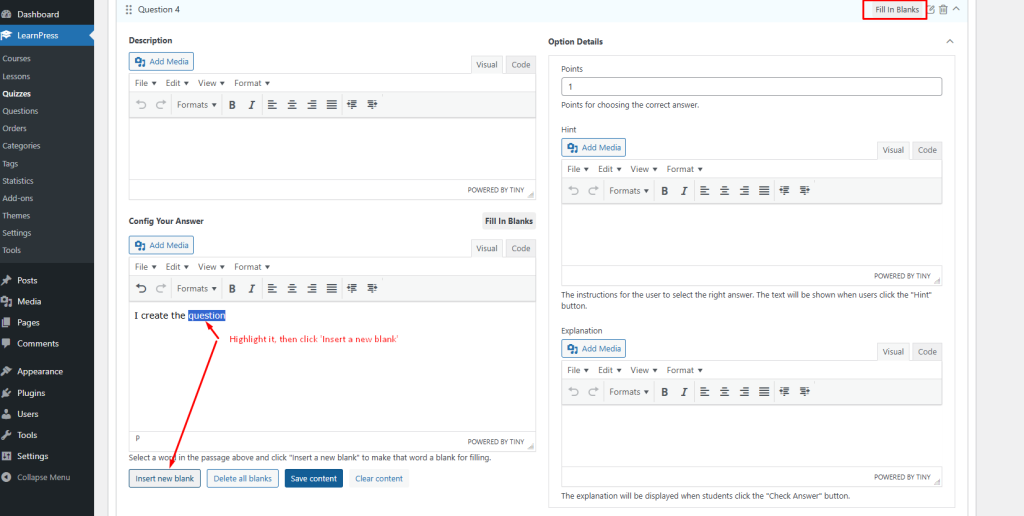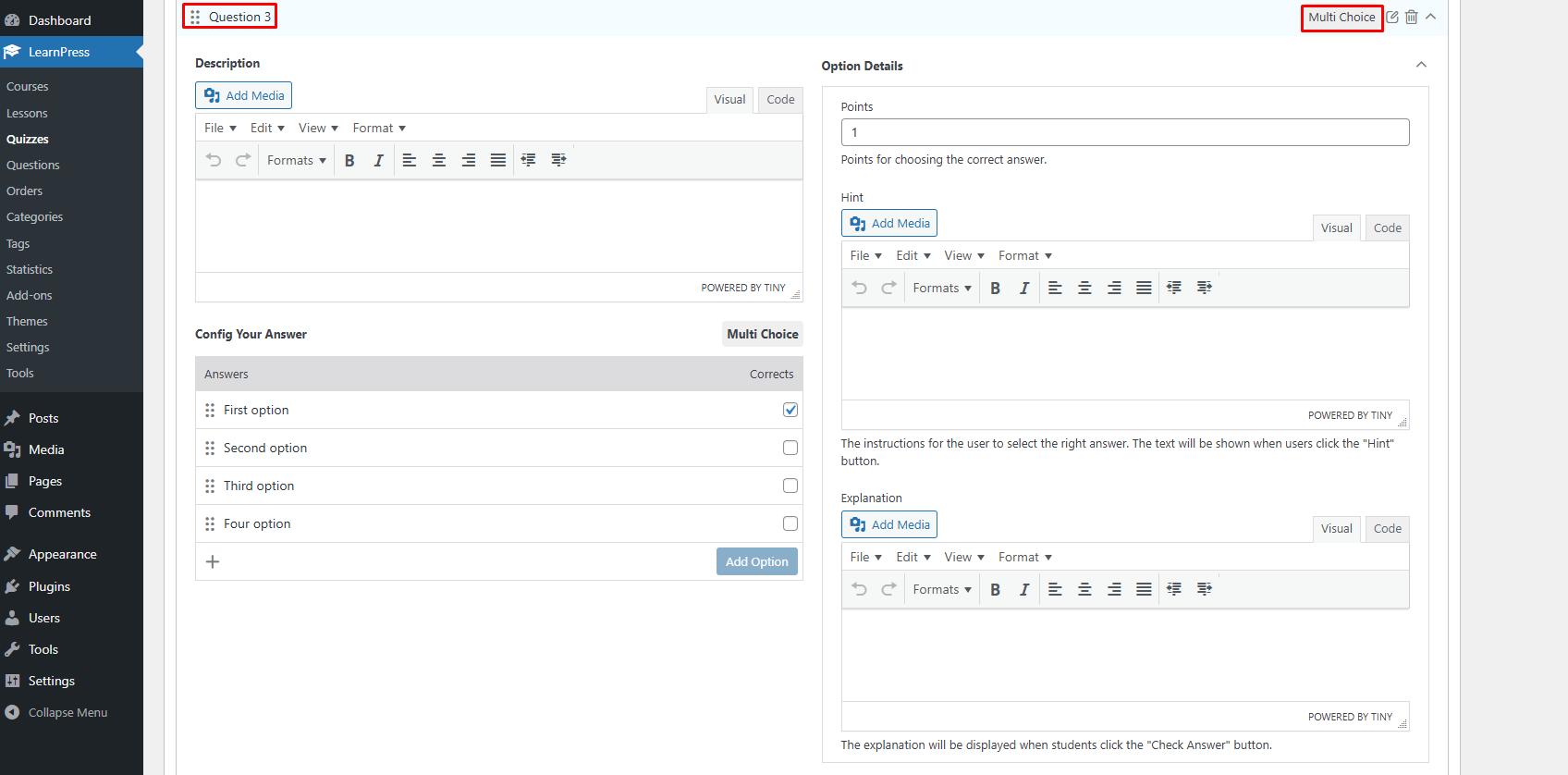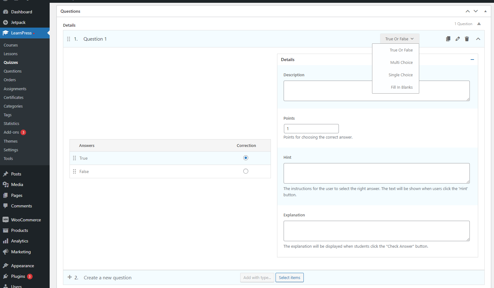 With LearnPress, we support True/False questions, single choice questions, multiple-choice questions, Fill in Blank.