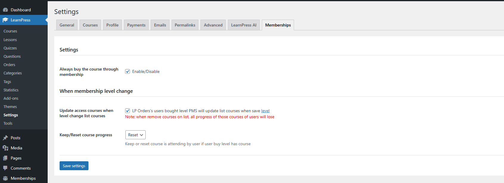 - Update access courses: when enable will update the list of courses on LP Order lastest has the status ‘Complete’ of each user when saving level PMS on Memberships Settings Levels